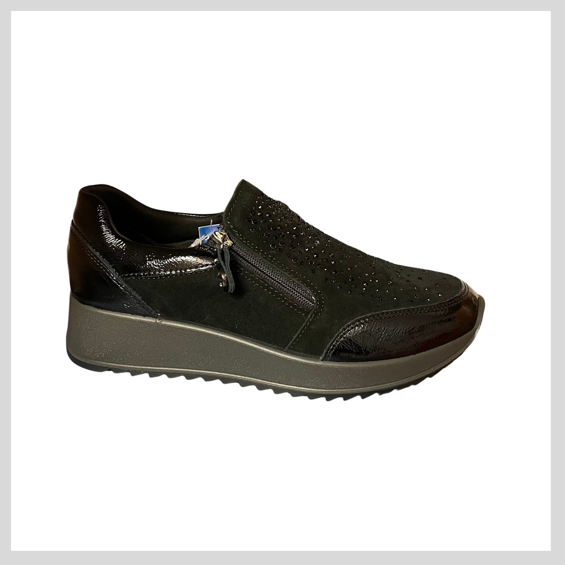 Ladies everyday shoe by Imac. Suede uppers with diamonte detail. Zip opening for easy on/off. Removable insole.