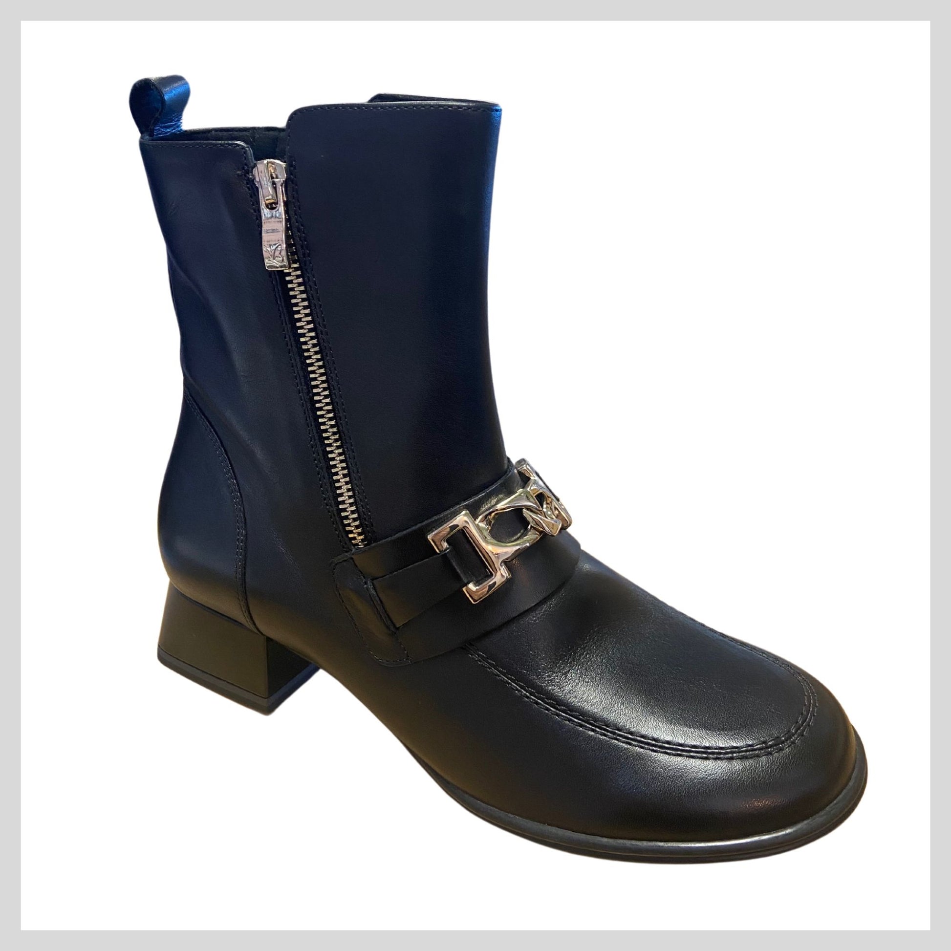 These Caprice boots in Black will be your go to this Season. The upper consists of a smooth black leather, featuring a beautiful gold chain detail. A full-length zip on the inner allows for an easy on off with an added otter functional zip that add beautiful character. The low-Square Block heel is ideal for everyday wear.