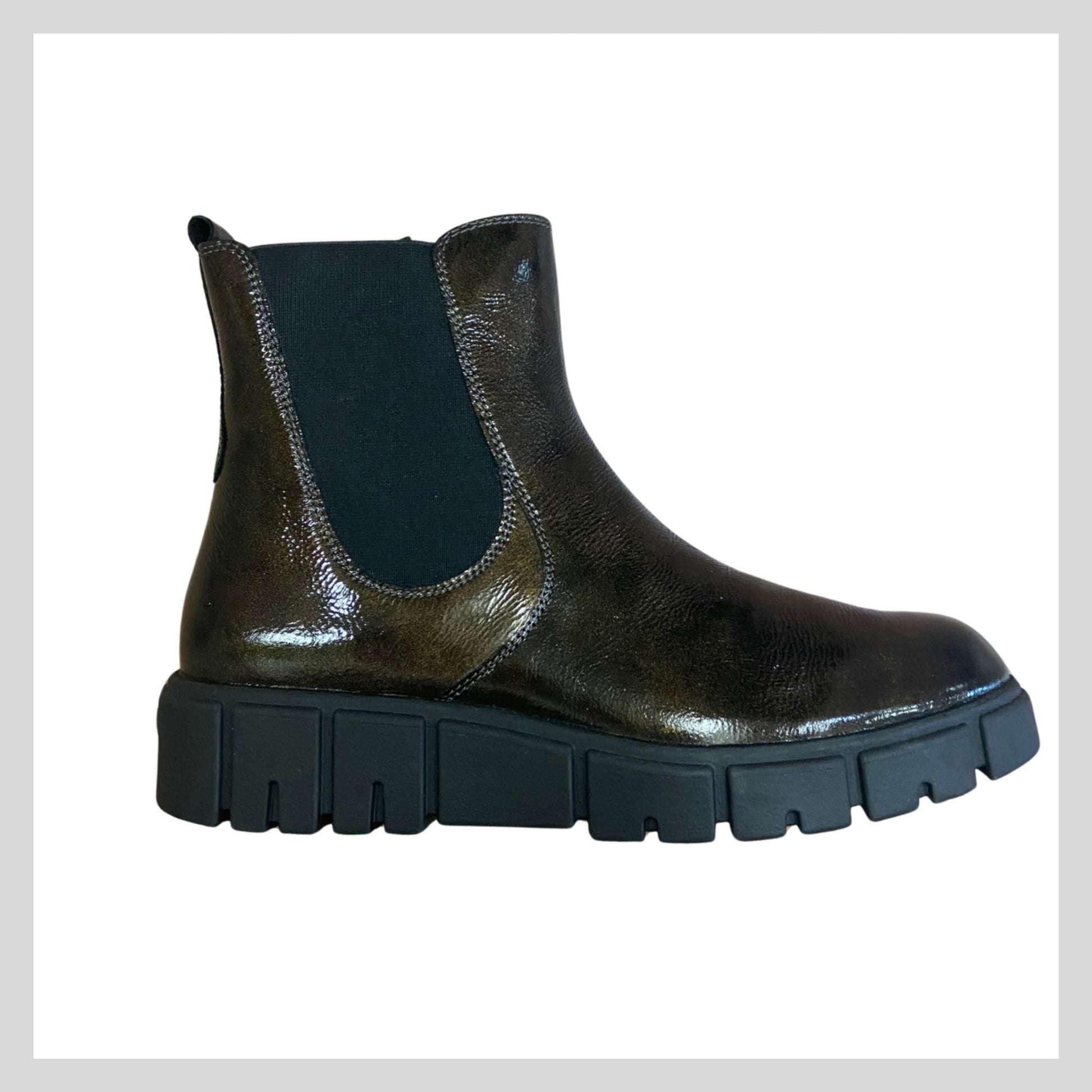 Ladies Brown patent leather ankle boot by Caprice. Small wedge heel with size zip's for easy on/off. These boots are made with soft leather and are fleeced lined, sure to keep you warm on those colder days.