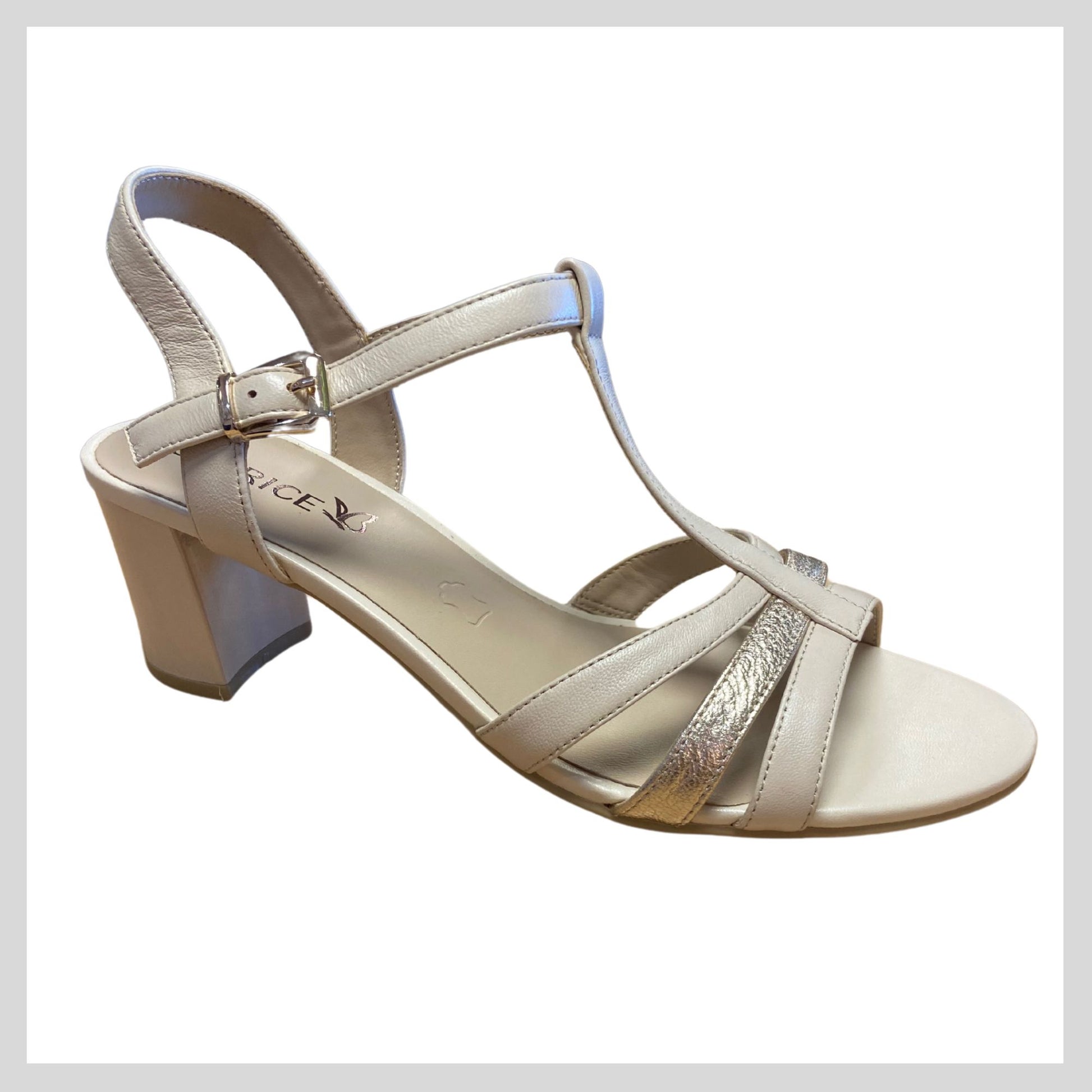 Caprice Cream/Gold Leather Sandal. With smooth leather and crossed straps design with buckle closure. Comfortable and versatile with sturdy heel, perfect for dancing.