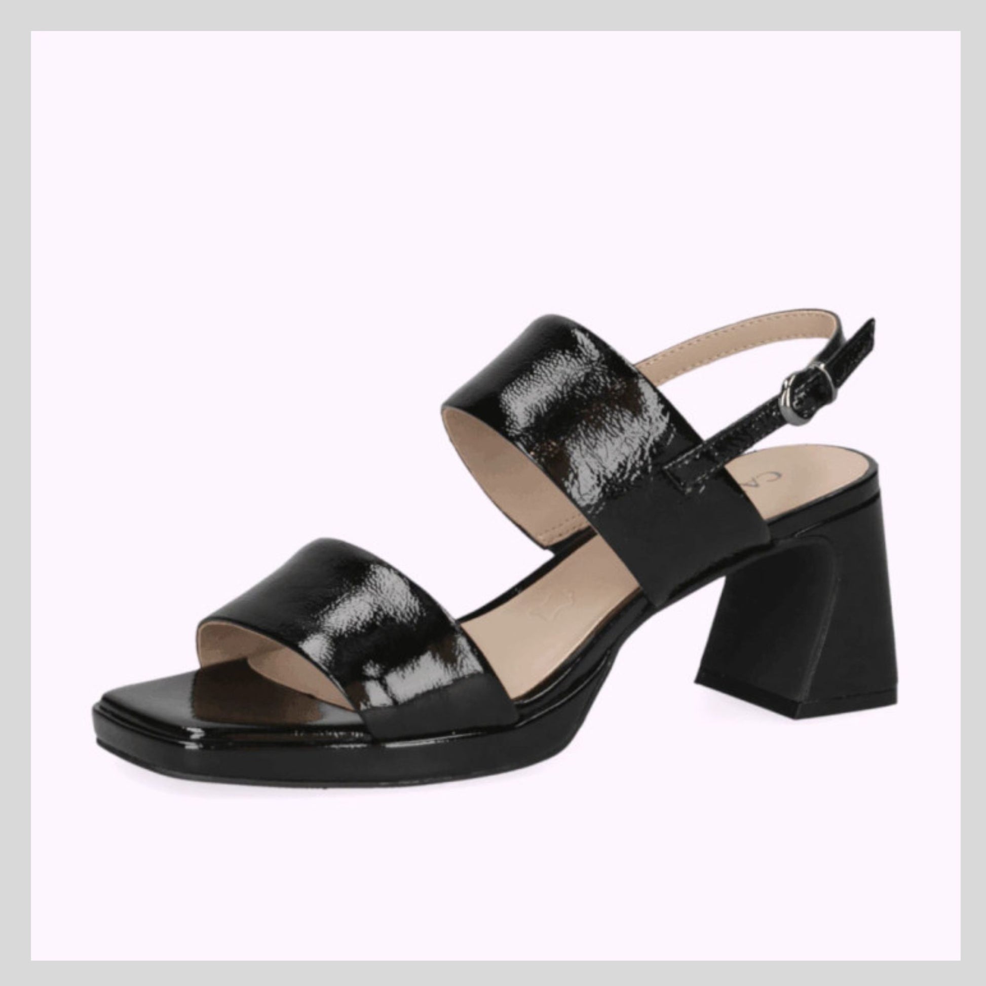 This Caprice Black Patent Dress Sandal is a stylish and comfortable choice for any occasion. With its leather uppers and linings, this sandal offers both durability and a touch of elegance. The lightweight rubber sole ensures comfort and ease of movement, while the memory foam insole provides cushioning for all-day wear. The sling back buckle fastening adds a stylish detail while also allowing for a secure fit. This sandal offers a subtle lift, making it perfect for both casual and dressy occasions.