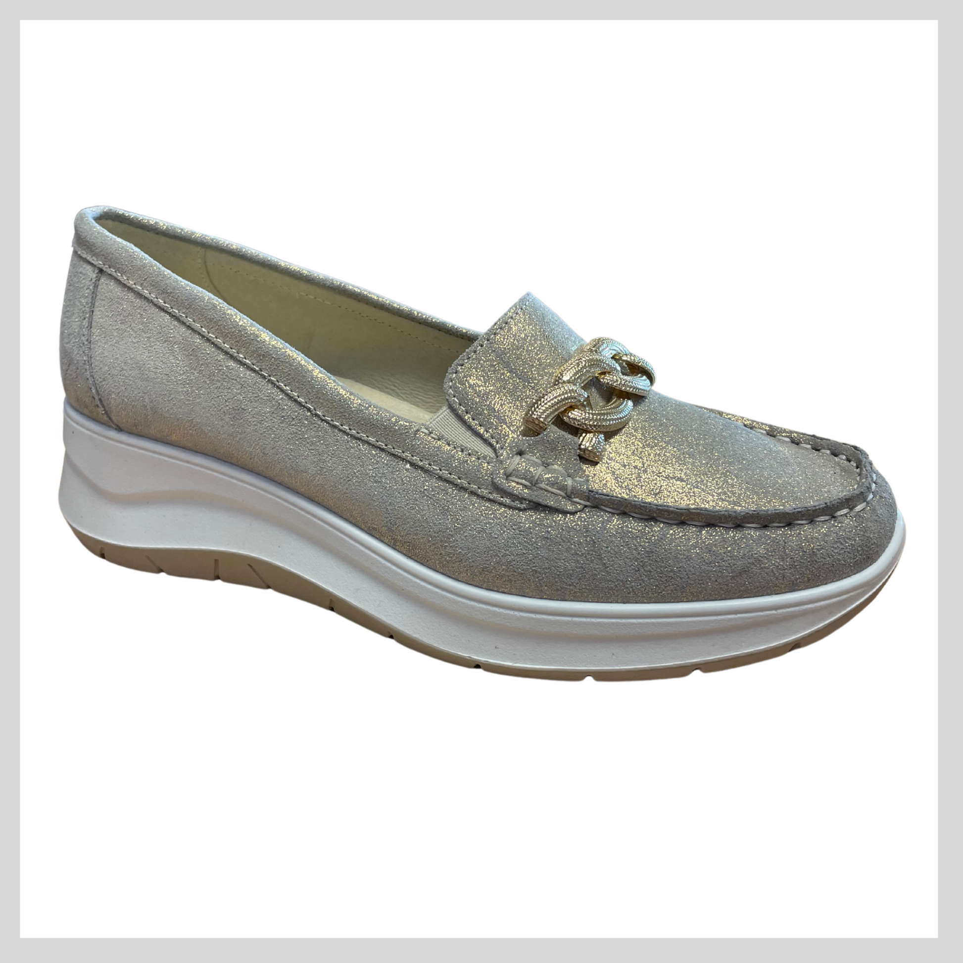 Leather moccasins with small wedge for comfortable fit. Leather lining with removable leather insole. Gold decorative link adds a beautiful finish.