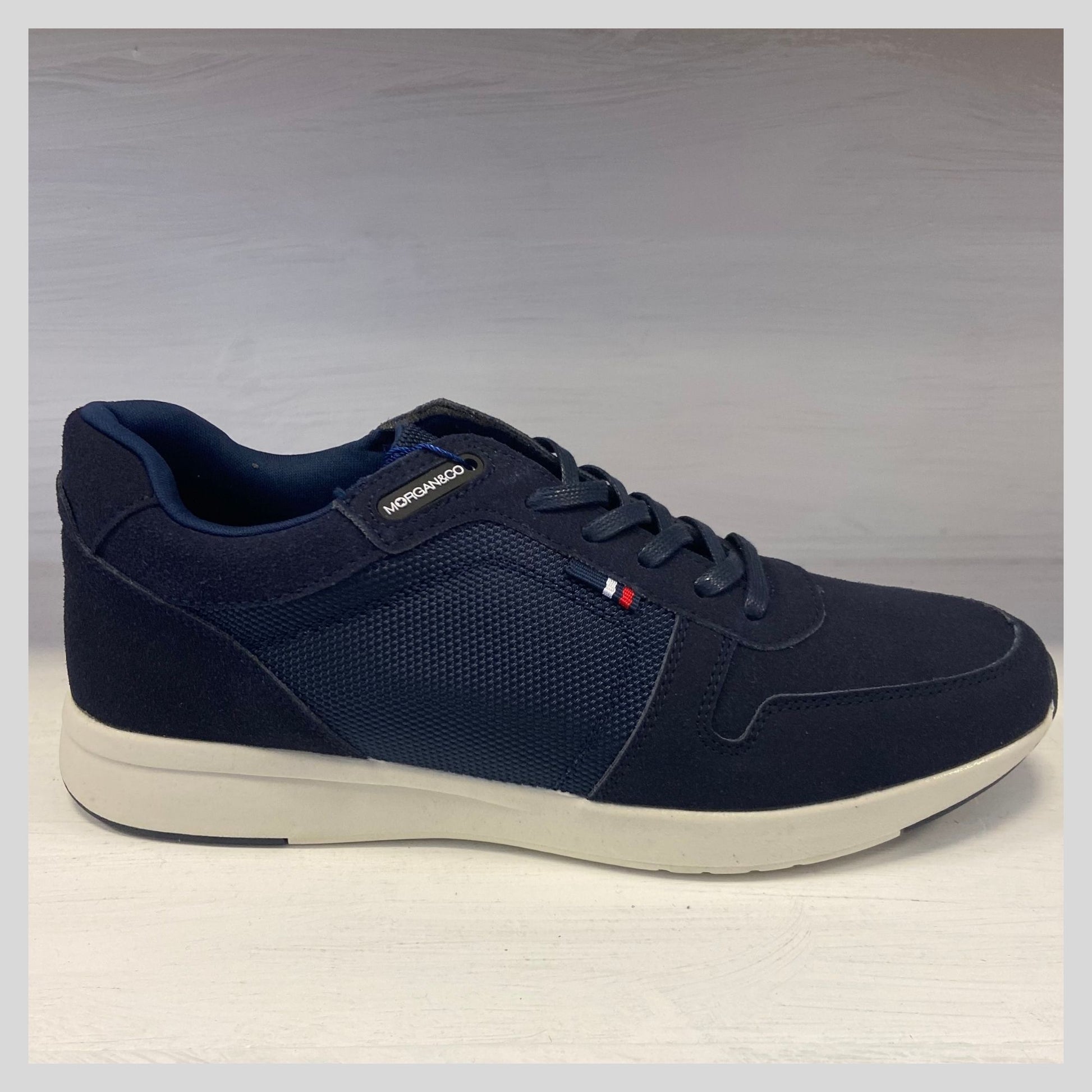 Casual mens shoes from Morgan & Co. This casual shoe with a sporty look has a Navy synthetic upper upon a white sole. Morgan & Co branding can be seen on the side of the shoe. Great casual style to wear with jeans.