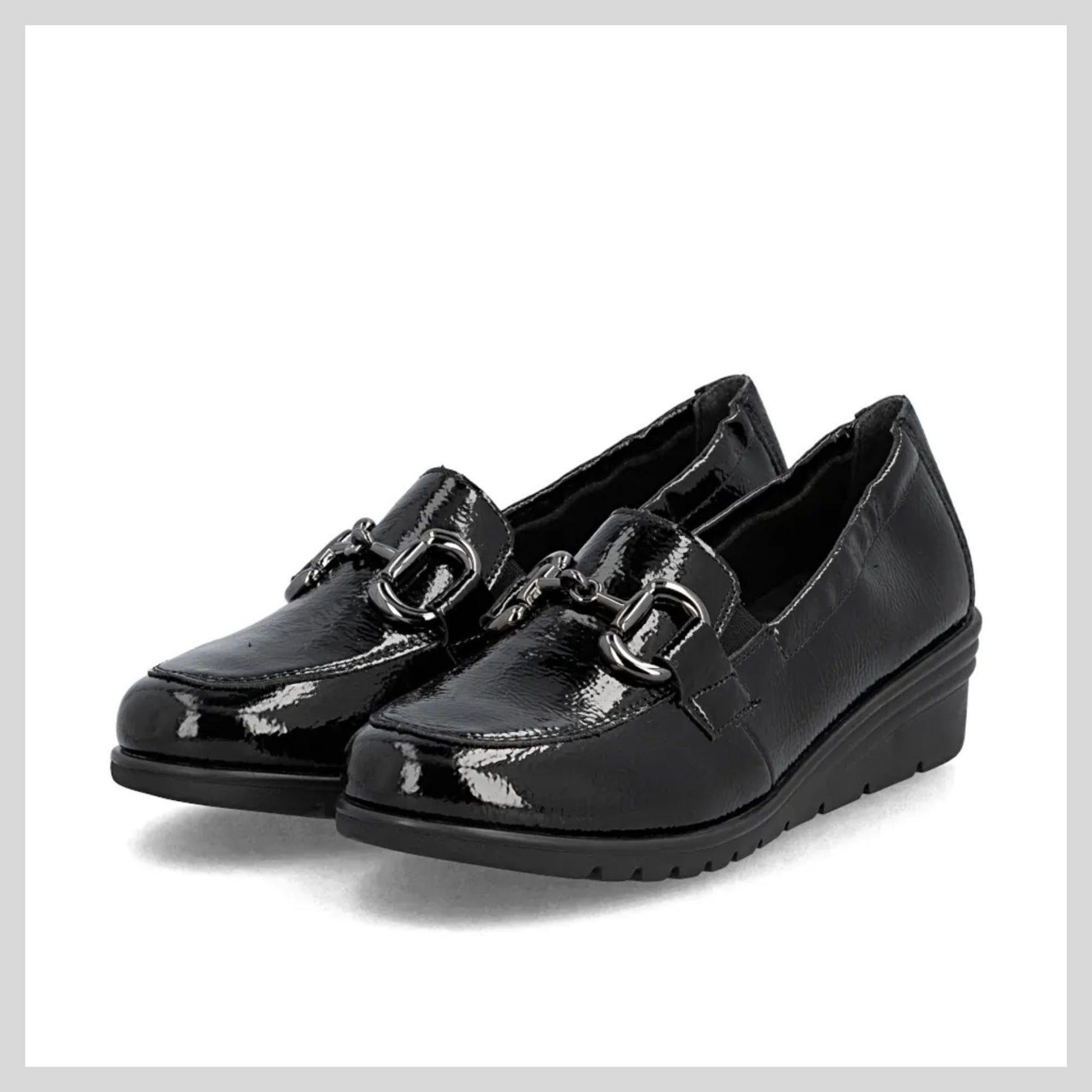 Slip them on and feel good with Rieker! These black Rieker women's loafers made of patent leather combine everything: comfort, function, and, of course, design. The elastic band makes them particularly easy to put on and take off. The grippy wedge sole provides support on different surfaces. The nubby insole is invigorating and massages the feet. All in one – great!