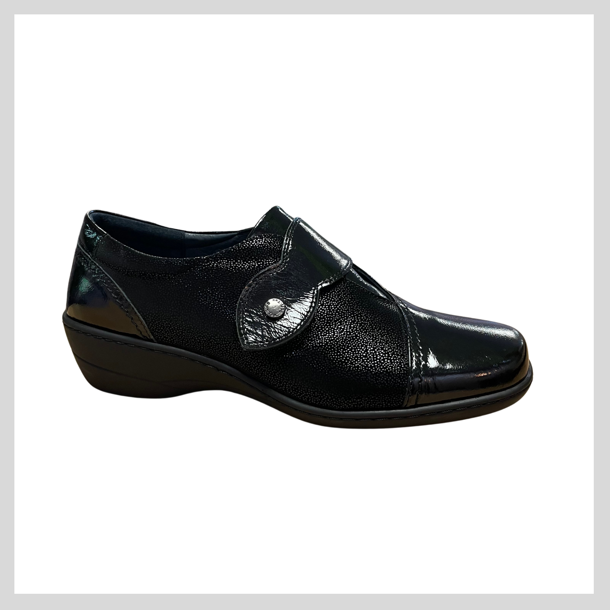 Wide fitting ladies shoes from Softmode. The upper is a patent leather. The padded insole, flexible sole & extra wide width provide optimum comfort. The velcro strap allows for easy on/off.