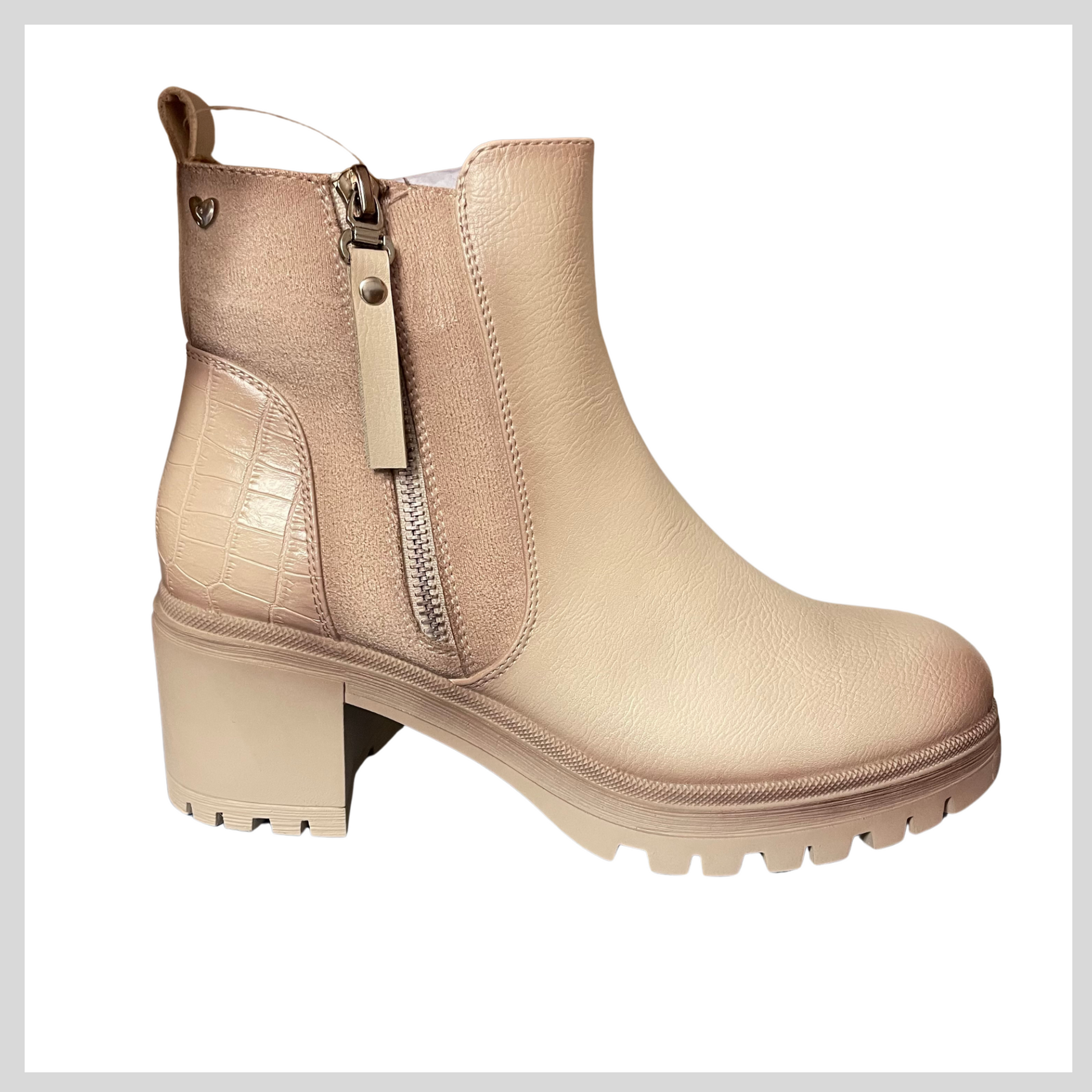Ladies chunky sole beige boot, with block heel. Decorative zip trim detail. Zip closure.